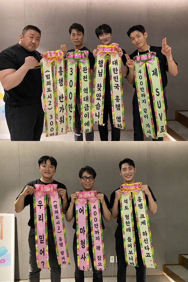흥행 주역인 배우들은 뜨거운 성원을 보내준 관객들을 향하여 감사 메시지가 담긴 화환 사진을 공개했다. 이번에 공개된 사진은 배우들이 직접 연기한 캐릭터들의 명대사를 활용한 감사 인사가 담긴 화환을 몸에 두르고 있어 눈길을 끈다. 괴물형사 ‘마석도’ 역을 맡은 마동석의 “‘범죄도시2’ 300만 흥행 반가워” 문구를 시작으로 ‘전일만’ 역을 소화한 최귀화의 “300만?! 완전 역대급이에요”, 이어 금천서 강력반 팀인 배우 허동원, 하준의 “행님 찾았습니다. 대한민국 흥행 영화”의 코멘트가 눈길을 끈다.