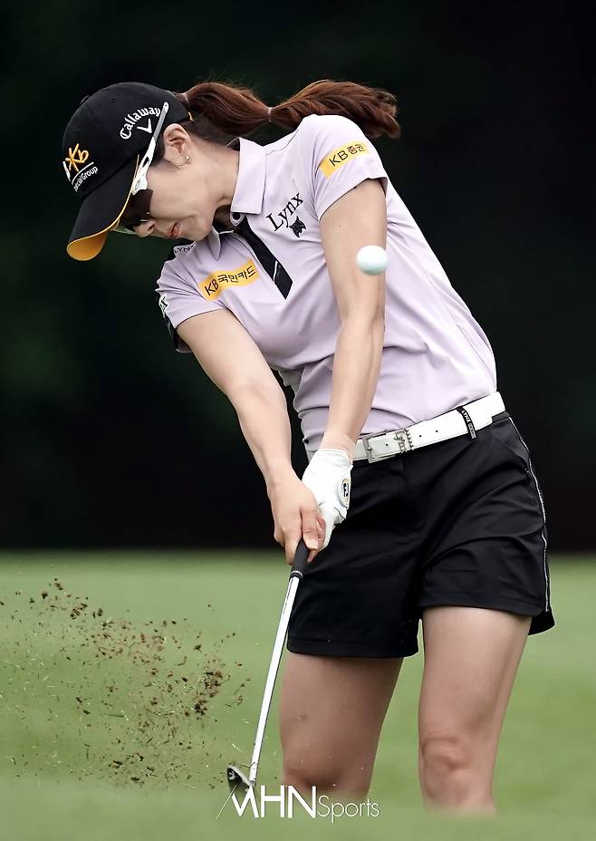 안송이(32.KB금융그룹)가 14번홀 세컨드샷을 날리고 있다.