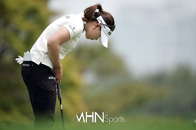 임희정(22.한국토지신탁)이 13번홀 그린에서 퍼트 라인을 살피고 있다.
