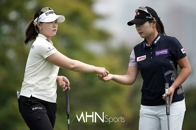 임희정(22.한국토지신탁)이 13번홀 그린에서 파로 마무리하며 홍정민에게 컨시드를 주고 있다.