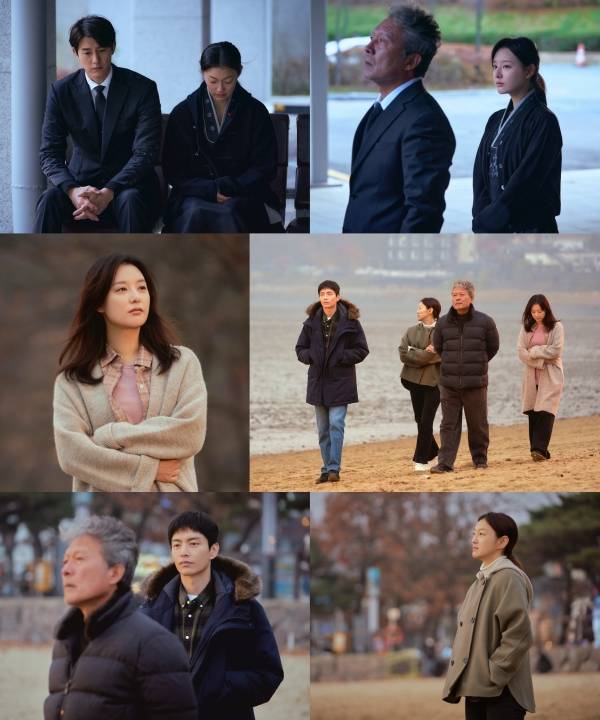 어머니가 세상을 떠난 이후, 삼 남매는 어떻게 일상을 이어갈까. 공개된 사진 속 슬픔에 잠긴 장례식장 풍경에서 이들 가족의 감정이 고스란히 전해진다. 조태훈(이기우 분)은 차마 고개를 들지 못하는 염기정(이엘 분)의 옆에서 힘이 되어주고, 염미정은 가만히 아버지의 뒷모습을 바라본다. 먼 곳을 응시하는 염제호의 깊은 눈빛은 또다시 슬픔을 몰고 온다. 이어진 사진에는 함께 여행을 떠난 염씨 가족의 낯선 풍경이 포착됐다. 바닷가를 거닐며 각자 생각에 잠긴 네 사람. 가슴 아픈 이별을 지나며 삶을 돌아보는 이들의 모습이 여운을 남긴다.