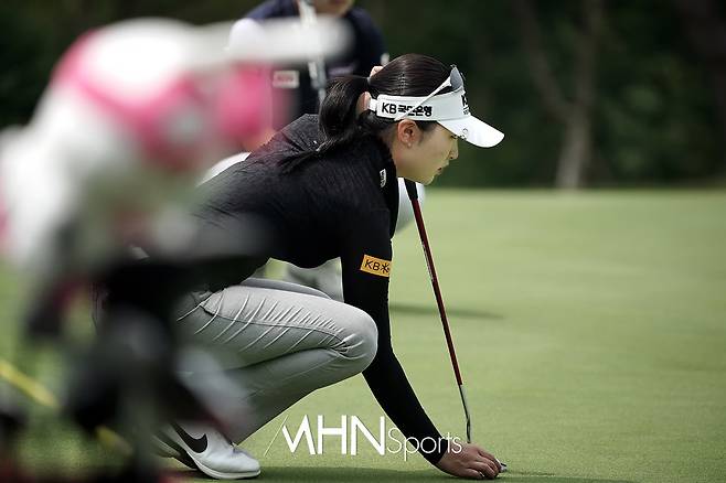 이예원(19.KB금융그룹)이 1번홀 그린에서 퍼트 라인을 살피고 있다.