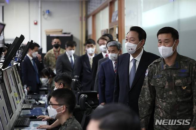[평택=뉴시스] 홍효식 기자 = 윤석열 대통령이 22일 경기 평택 오산 미 공군기지 항공우주작전본부 중앙방공통제소를 방문하고 있다. 2022.05.22. yesphoto@newsis.com