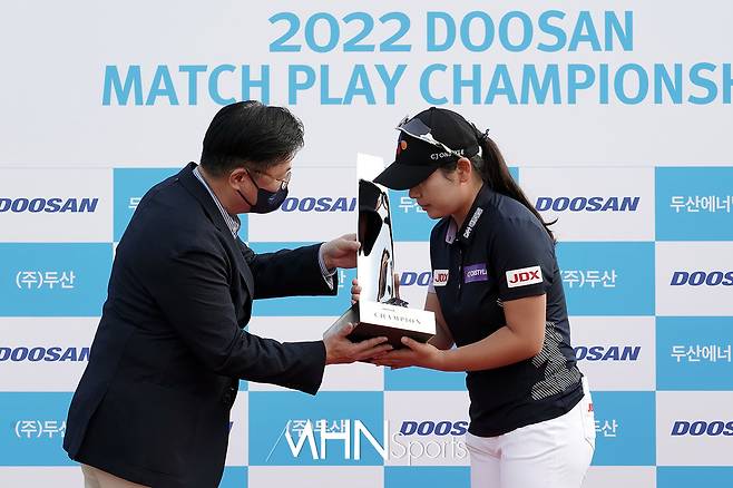 홍정민이 생애 첫 우승트로피를 받고 있다.