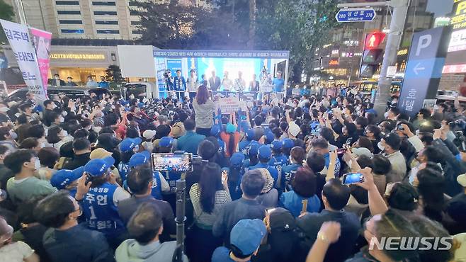 [울산=뉴시스] 배병수 기자 = 더불어민주당 이재명 총괄선거대책위원장이 22일 오후 울산 남구 롯데호텔정문앞에서 울산 출마자들을 위해 지원유세를 하고 있다. 2022.05.22. bbs@newsis.com