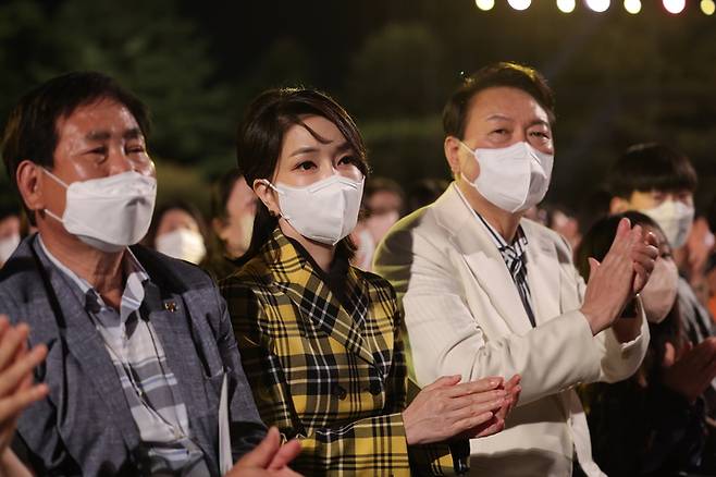 [서울=뉴시스] 윤석열 대통령과 김건희 여사가 22일 청와대 본관 앞 대정원에서 열린 KBS 열린음악회를 찾아 공연을 관람하고 있다. (사진=대통령실 제공) 2022.05.22. photo@newsis.com *재판매 및 DB 금지