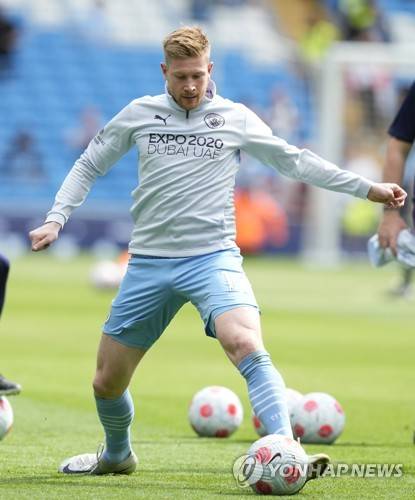 epa09966088 Kevin De Bruyne of Manchester City warms up for the English Premier League soccer match between Manchester City and Aston Villa in Manchester, Britain, 22 May 2022. EPA/ANDREW YATES EDITORIAL USE ONLY. No use with unauthorized audio, video, data, fixture lists, club/league logos or 'live' services. Online in-match use limited to 120 images, no video emulation. No use in betting, games or single club/league/player publications