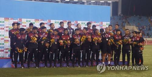 epa09966108 The team of Indonesia celebrate the bronze medal in the soccer tournament of the 31st Southeast Asian Games (SEA Games 31) at My Dinh stadium in Hanoi, Vietnam, 22 May 2022. EPA/LUONG THAI LINH