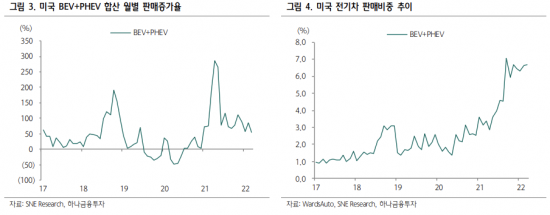 1분기 미국 전기차 시장은 21만5000대로 지난해 같은 기간보다 63% 증가했다. 판매 비중은 3.2%포인트로 지난해 같은 기간보다 6.6% 상승했다. 이 중 순수전기차(BEV)가 17만3000대였는데 테슬라가 12만6000대로 BEV내 점유율은 76%를 기록했다. 현대차와 기아는 각각 4%와 5%의 점유율을 기록했는데, 연초 전기차 전용 모델인 아이오닉5와 EV6를 수출해 6244대, 5281대를 판매하면서 점유율 상승세를 이어가고 있다.