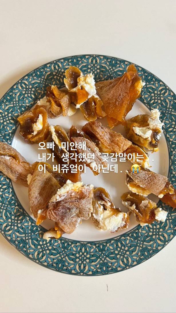 이다은은 23일 자신의 인스타그램에 "오빠 미안해. 내가 생각했던 곶감말이는 이 비주얼이 아닌데..그래도 짠"이라는 글과 함께 사진을 게재했다.