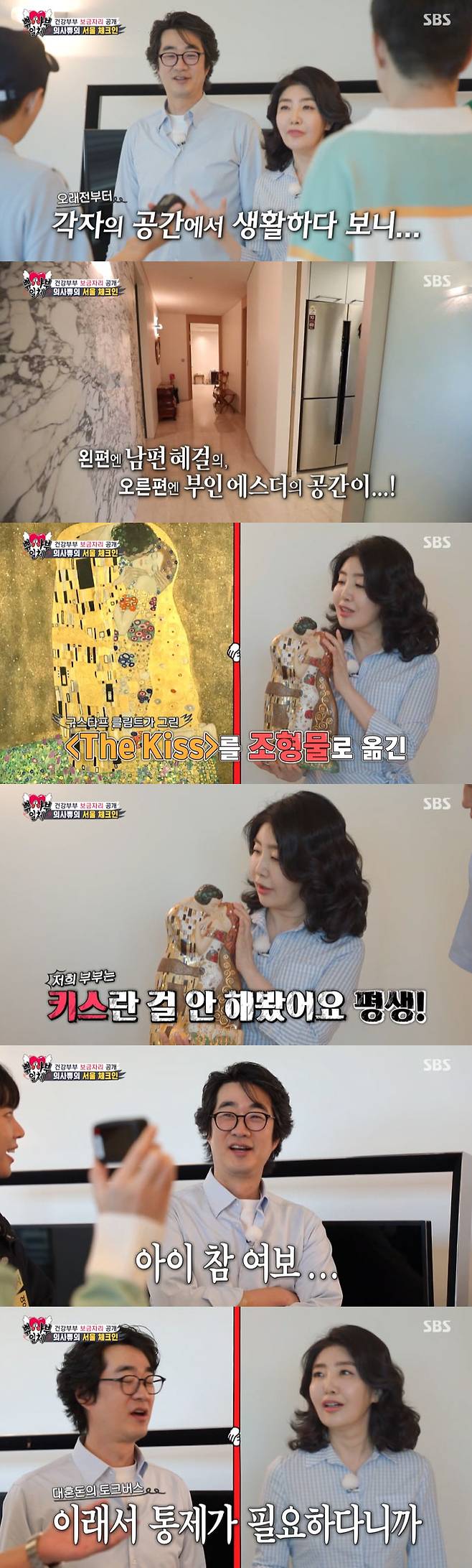 집 내부를 구경하던 중 멤버들은 거실에 놓인 클림트의 '더 키스' 조형물에 관심을 보였다. 이에 여에스더는 "저희 부부는 키스라는 것을 안 해봤다. 평생"이라고 밝혔다.