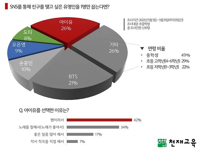 설문조사에 참여한 초·중학생들이 밝힌 가수 아이유와 SNS 친구를 맺고 싶은 이유로는 ▲팬이라서, ▲노래를 잘해서(노래가 좋아서), ▲좋은 일을 많이 해서, ▲작사와 작곡을 직접 해서 순이었다.