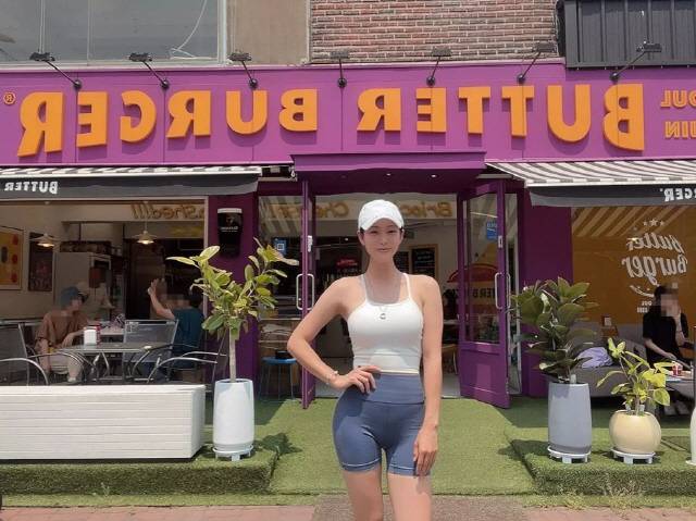 공개된 사진 속 신수지는 햄버거집 앞에서 포즈를 취하고 있는 모습. 끈나시에 반바지 레깅스를 입은 과감한 패션을 선보인 신수지는 완벽한 몸매를 자랑해 시선을 모은다.