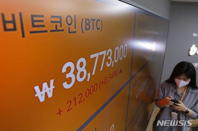 [서울=뉴시스] 고승민 기자 = 비트코인이 연중 최저가 안팎에서 고전중인 23일 서울 서초구 빗썸 고객지원센터에서 관계자가 시세를 확인하고 있다. 최근 비트코인을 포함한 코인시장 전반이 조정세를 겪고 있다. 루나와 스테이블 코인 테라의 폭락 사태 때문이다. 금융위원회와 금융감독원은 최근 루나 사태와 관련해 국내 거래소를 통해 스테이블 코인의 유의점을 적극 알리도록 권고했다. 2022.05.23. kkssmm99@newsis.com