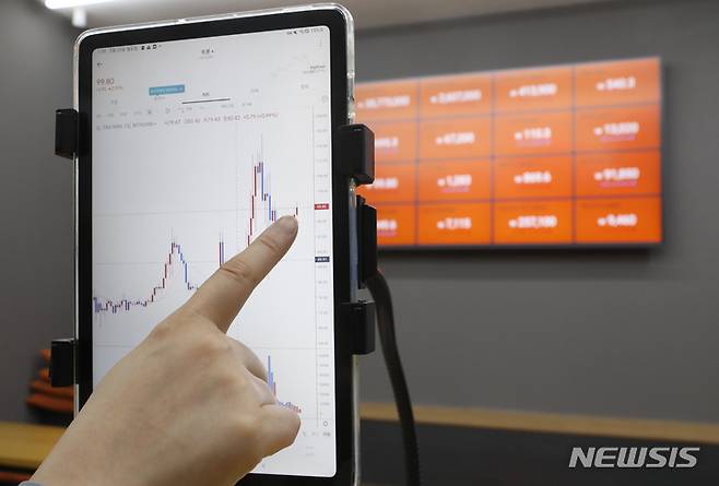 [서울=뉴시스] 고승민 기자 = 비트코인이 연중 최저가 안팎에서 고전중인 23일 서울 서초구 빗썸 고객지원센터에서 관계자가 시세를 확인하고 있다. 최근 비트코인을 포함한 코인시장 전반이 조정세를 겪고 있다. 루나와 스테이블 코인 테라의 폭락 사태 때문이다. 금융위원회와 금융감독원은 최근 루나 사태와 관련해 국내 거래소를 통해 스테이블 코인의 유의점을 적극 알리도록 권고했다. 2022.05.23. kkssmm99@newsis.com