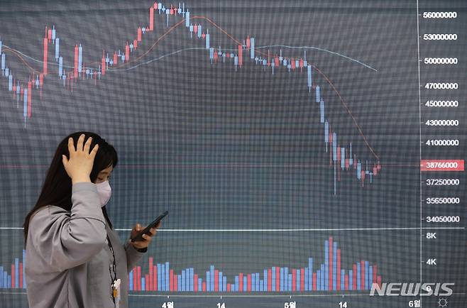 [서울=뉴시스] 고승민 기자 = 비트코인이 연중 최저가 안팎에서 고전중인 23일 서울 서초구 빗썸 고객지원센터에서 관계자가 시세를 확인하고 있다. 최근 비트코인을 포함한 코인시장 전반이 조정세를 겪고 있다. 루나와 스테이블 코인 테라의 폭락 사태 때문이다. 금융위원회와 금융감독원은 최근 루나 사태와 관련해 국내 거래소를 통해 스테이블 코인의 유의점을 적극 알리도록 권고했다. 2022.05.23. kkssmm99@newsis.com
