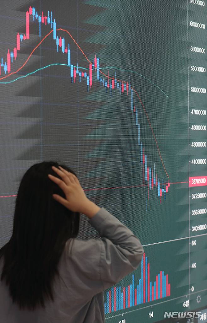 [서울=뉴시스] 고승민 기자 = 비트코인이 연중 최저가 안팎에서 고전중인 23일 서울 서초구 빗썸 고객지원센터에서 관계자가 시세를 확인하고 있다. 최근 비트코인을 포함한 코인시장 전반이 조정세를 겪고 있다. 루나와 스테이블 코인 테라의 폭락 사태 때문이다. 금융위원회와 금융감독원은 최근 루나 사태와 관련해 국내 거래소를 통해 스테이블 코인의 유의점을 적극 알리도록 권고했다. 2022.05.23. kkssmm99@newsis.com
