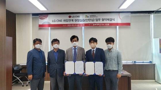 충북대학교(총장 김수갑) SW중심대학사업단이 오늘 5월 20일(금) 오후 2시에 충북대 E9동 103호에서 학생들에게 ‘취업연계현장실습(인턴십) 프로그램’을 제공하기 위해 ‘LG CNS와 취업연계현장실습 MOU’를 체결했다. 이날 행사에는 이건명 SW중심대학사업단장을 비롯해 박찬식 교수(SW산학협력센터장), 강재구 산학협력중점교수, 이준희 LG CNS 인사팀장, 문종열 인사담당이 참석했다.