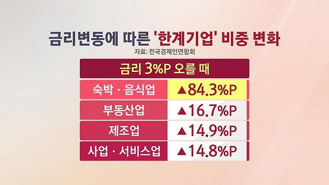 전국경제인연합회는 금리가 3%P 오를 경우 숙박·음식업은 85% 가까이 이자조차 갚지 못하는 상태로 전락할 것으로 내다봤습니다.