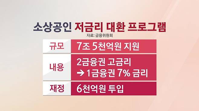 정부는 또 7조 5,000억 원 규모의 소상공인과 자영업자 2금융권 대출을 1금융권 7% 금리로 바꿔주는 방안을 추진하고 있습니다.
