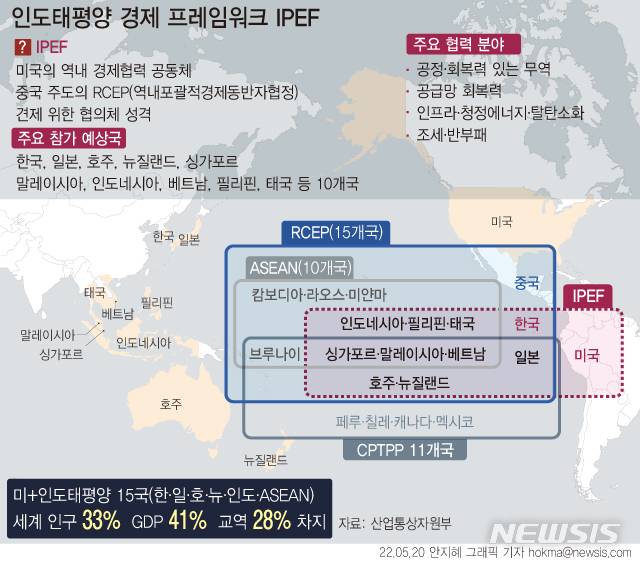 IPEF에 인도, 인도네시아, 베트남 등 주요 신흥국이 동참함에 따라 인프라 투자, 역량 강화 등 공동 프로젝트에 우리 기업의 인태 지역 진출 기회도 확대될 수 있다고 봤다.