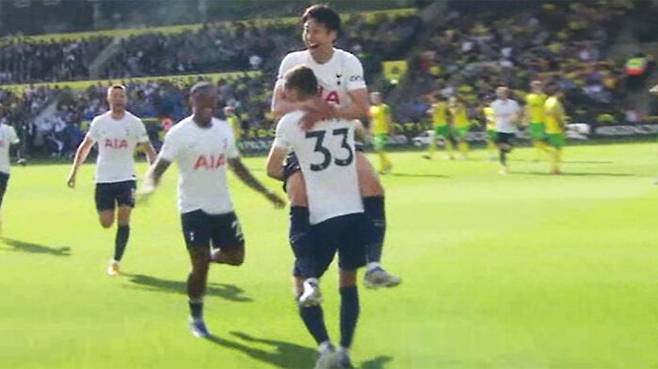 [중계멘트 : 손흥민 시도해보나요? 들어갔습니다! 손흥민의 엄청난 골입니다! 후반전 들어서 완전히 살아났습니다.]