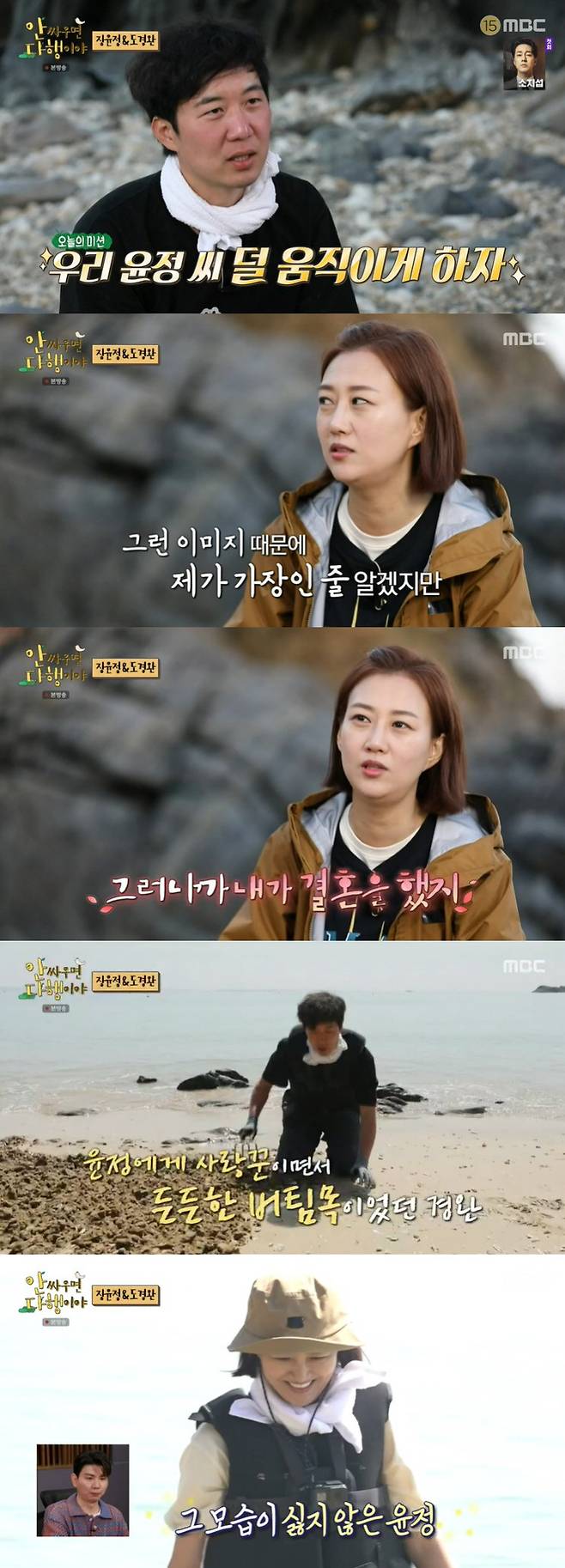 식사 후 물이 빠진 틈을 타 부부는 본격적으로 식재로 구하기에 나섰다. 이날의 타겟은 골뱅이. 골뱅이의 생김새도 몰랐던 도경완은 "오늘은 윤정 씨를 덜 움직이게 하겠다"며 다시 한 번 호기롭게 나섰다. 장윤정은 "제가 야무지고 돈 잘 벌고 그런 이미지 때문에 당연히 모든 결정은 제가 하는 줄 알겠지만 경완 씨가 되게 리더십도 있고 남자다움과 엄격함이 있다. 그러니까 제가 결혼을 했다"며 "방송 속 모습이 전부가 아니다. 저를 챙기고 하는 건 사실이지만 그게 전부는 아니"라고 도경완을 치켜세웠다.