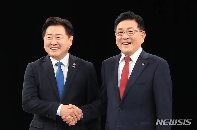 [제주=뉴시스] 우장호 기자 = 23일 오후 제주시 도남동 KBS 제주방송총국에서 열린 제8회 전국동시지방선거 제주지사 후보자 토론회에 참석한 오영훈·허향진(오른쪽) 후보가 본격적인 토론에 앞서 기념촬영 하고 있다.