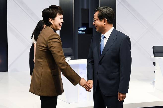 [서울=뉴시스] 국회사진기자단 = 김은혜 국민의힘, 김동연 더불어민주당 경기도지사 후보가 23일 서울 마포구 SBS 스튜디오에서 진행된 경기도선거방송토론위원회 주관 제8회 전국동시지방선거 경기도지사 후보자 토론회 시작에 앞서 인사를 하고 있다. 2022.05.23. photo@newsis.com