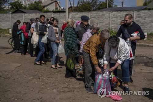 People queue to receive flour at a food donation spot in Kharkiv, eastern Ukraine, Monday, May 23, 2022. (AP Photo/Bernat Armangue)