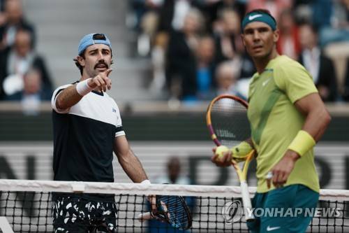 Australia's Jordan Thompson, left, argues over a line call as Spain's Rafael Nadal looks on during their first round match at the French Open tennis tournament in Roland Garros stadium in Paris, France, Monday, May 23, 2022. (AP Photo/Thibault Camus)