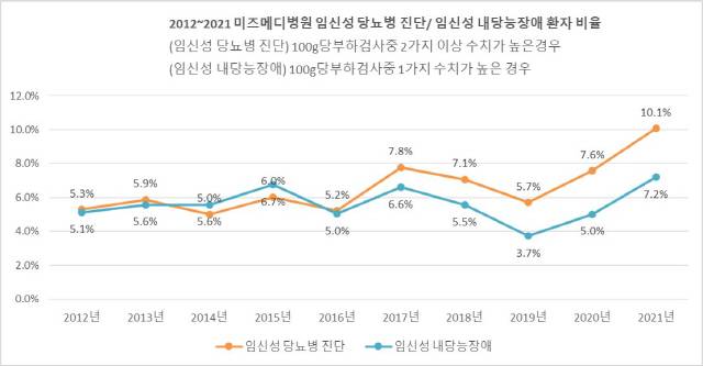 10년 동안의 임신성 당뇨병 진단비율을 살펴보면 2012년에는 5.3%, 2017년도에는 7.8%, 2021년에는 10.1%로 꾸준히 증가해 10년 동안 약 2배 증가한 것으로 나타났다.