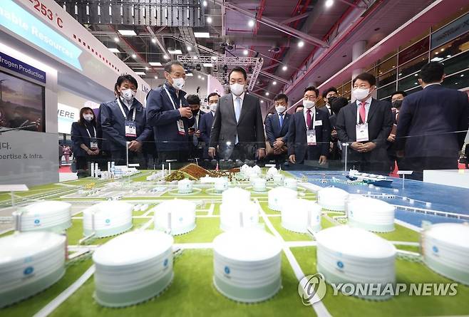 (대구=연합뉴스) 안정원 기자 = 윤석열 대통령이 24일 대구 엑스코에서 열린 2022대구세계가스총회(WGC)에 참석, 한국가스공사 전시장에서 LNG-LH2 하이브리드 인수기지 모형을 살펴보고 있다. 2022.5.24
