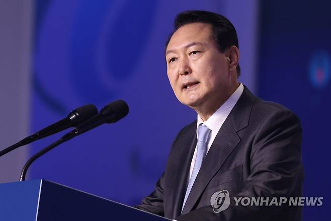 (대구=연합뉴스) 안정원 기자 = 윤석열 대통령이 24일 대구 엑스코에서 열린 2022대구세계가스총회(WGC)에서 축사를 하고 있다. 2022.5.24