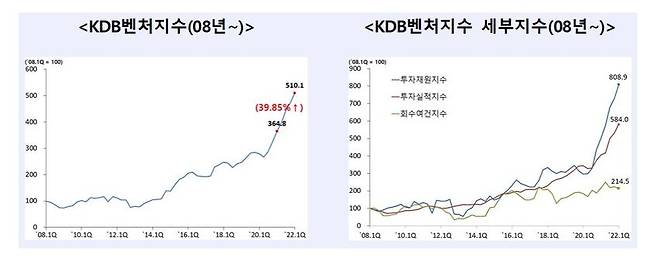산업은행은 국내 벤처업계 시장환경을 가리키는 KDB벤처지수가 1분기 510.1로 작년 동기 대비 39.9% 상승했다고 오늘(24일) 밝혔습니다.