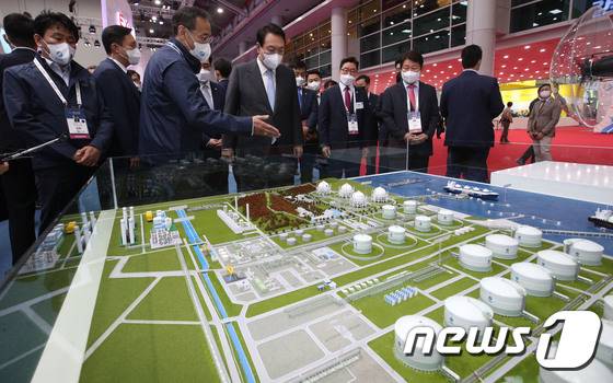 (대구=뉴스1) 오대일 기자 = 윤석열 대통령이 24일 대구 엑스코(EXCO)에서 열린 2022 세계가스총회 개회식에 참석, 한국가스공사 부스에서 LNG 저장탱크 모형을 살펴보고 있다.