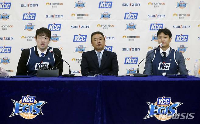 [서울=뉴시스] 최동준 기자 = FA를 통해 전주 KCC 이지스에 입단한 이승현, 허웅이 24일 서울 서초구 KCC 본사에서 열린 입단식 및 기자회견에서 소감을 말하고 있다. 2022.05.24. photocdj@newsis.com