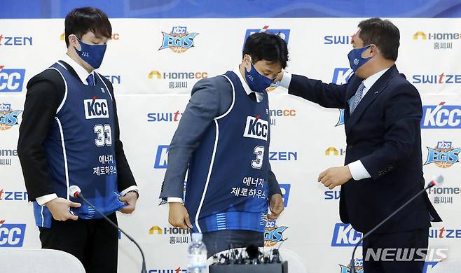 [서울=뉴시스] 최동준 기자 = FA를 통해 전주 KCC 이지스에 입단한 이승현, 허웅이 24일 서울 서초구 KCC 본사에서 열린 입단식 및 기자회견에서 전창진 감독으로부터 받은 유니폼을 입고 있다. 2022.05.24. photocdj@newsis.com