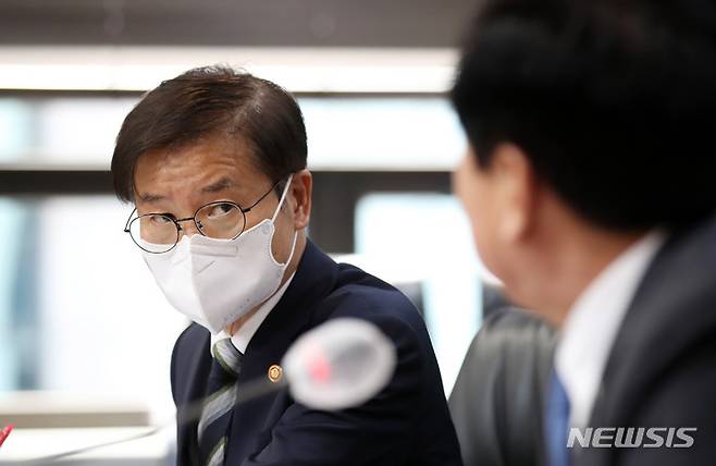 [서울=뉴시스] 고범준 기자 = 이정식 신임 고용노동부 장관이 24일 오후 서울 영등포구 중소기업중앙회를 방문해 김기문 중소기업중앙회 회장의 인사말을 듣고 있다. 2022.05.24. bjko@newsis.com