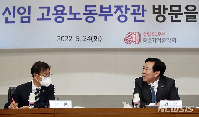 [서울=뉴시스] 고범준 기자 = 이정식(왼쪽) 신임 고용노동부 장관이 24일 오후 서울 영등포구 중소기업중앙회를 방문해 김기문 중소기업중앙회 회장의 인사말을 듣고 있다. 2022.05.24. bjko@newsis.com