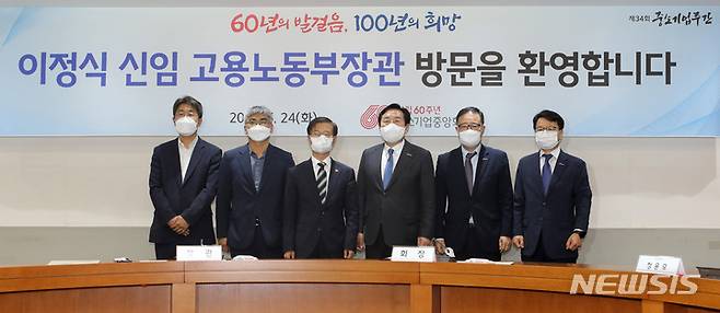 [서울=뉴시스] 고범준 기자 = 이정식(왼쪽 세번째) 신임 고용노동부 장관이 24일 오후 서울 영등포구 중소기업중앙회를 방문해 김기문(오른쪽 세번째) 중소기업중앙회 회장을 비롯한 참석자들과 기념촬영을 하고 있다. 2022.05.24. bjko@newsis.com