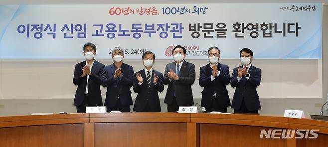 [서울=뉴시스] 고범준 기자 = 이정식(왼쪽 세번째) 신임 고용노동부 장관이 24일 오후 서울 영등포구 중소기업중앙회를 방문해 김기문(오른쪽 세번째) 중소기업중앙회 회장을 비롯한 참석자들과 기념촬영을 하고 있다. 2022.05.24. bjko@newsis.com