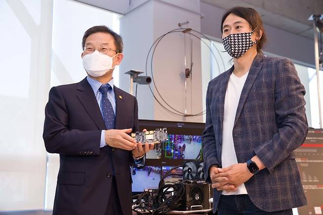 [서울=뉴시스] 이종호 과학기술정보통신부 장관이 24일 오후 서울 강남구 퓨리오사AI를 방문해 백준호 퓨리오사AI 대표로부터 'AI반도체 소개 및 영상인식 기술' 설명을 듣고 있다. (사진=과학기술정보통신부 제공) 2022.05.24. photo@newsis.com *재판매 및 DB 금지