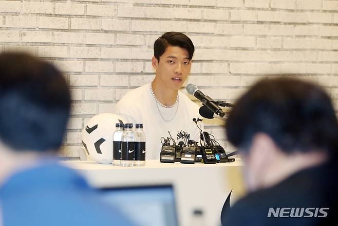 [서울=뉴시스] 고승민 기자 = 6월 A매치를 위해 귀국한 황희찬(울버햄튼)이 24일 서울 청담동 서클81(Circle81)에서 열린 기자간담회에서 취재진 질문에 답하고 있다. 2022.05.24. kkssmm99@newsis.com
