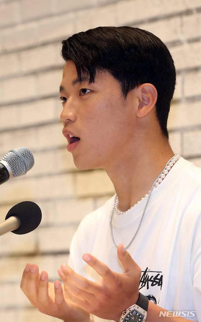 [서울=뉴시스] 고승민 기자 = 6월 A매치를 위해 귀국한 황희찬(울버햄튼)이 24일 서울 청담동 서클81(Circle81)에서 열린 기자간담회에서 취재진 질문에 답하고 있다. 2022.05.24. kkssmm99@newsis.com