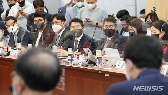 [서울=뉴시스] 고범준 기자 = 24일 서울 여의도 국회의원회관에서 열린 디지털 자산기본법 제정과 코인 마켓 투자자보호 대책 긴급 당정 간담회에서 프로비트 도현수 대표, 지닥 한승환 대표, 코어닥스 임요송 대표 등 참석자들이 성일종 정책위의장의 발언을 경청하고 있다. (공동취재사진) 2022.05.24. photo@newsis.com