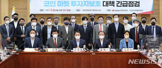 [서울=뉴시스] 고범준 기자 = 성일종 국민의힘 정책위의장이 24일 서울 여의도 국회의원회관에서 열린 디지털 자산기본법 제정과 코인 마켓 투자자보호 대책 긴급 당정 간담회에서 김소영 금융위 부위원장, 전요섭 FIU 제도운영기획관, 업비트 이석우 대표, 빗썸 허백영 대표 등 참석자들과 기념촬영을 발언을 하고 있다. (공동취재사진) 2022.05.24. photo@newsis.com