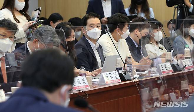 [서울=뉴시스] 고범준 기자 = 24일 서울 여의도 국회의원회관에서 열린 디지털 자산기본법 제정과 코인 마켓 투자자보호 대책 긴급 당정 간담회에서 프로비트 도현수 대표, 지닥 한승환 대표, 코어닥스 임요송 대표 등 참석자들이 윤재옥 정무위원장의 발언을 경청하고 있다. (공동취재사진) 2022.05.24. photo@newsis.com