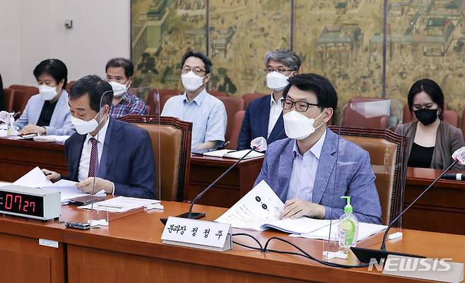 [서울=뉴시스] 김선웅 기자 = 국회 언론미디어 제도개선 특별위원회 자문위 정정주 미디어 신뢰도 개선 분과장이 24일 오후 서울 여의도 국회에서 열린 특위 전체회의에서 최종보고를 하고 있다. (공동취재사진) 2022.05.24. photo@newsis.com