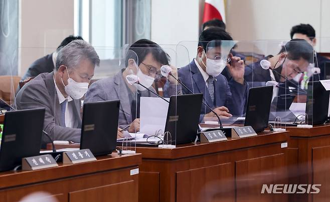 [서울=뉴시스] 김선웅 기자 = 국회 언론미디어 제도개선 특별위원회 더불어민주당 소속 위원들이 24일 오후 서울 여의도 국회에서 열린 특위 전체회의에서 회의자료를 살펴보고 있다. (공동취재사진) 2022.05.24. photo@newsis.com